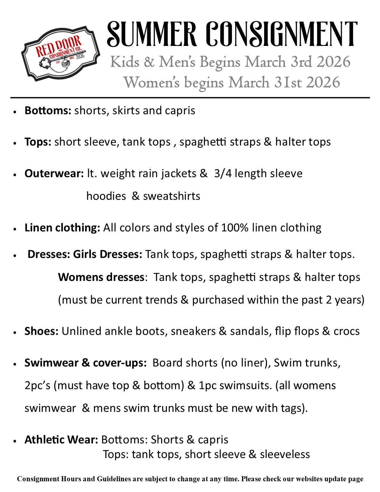 Consignment & store hours are subject to change at any time. Please see our updates page for any changes in consignment hours, consignment acceptance, and store hours. In the event of an emergency due to severe weather or other unforeseen emergency events, we will post to our Facebook page only.